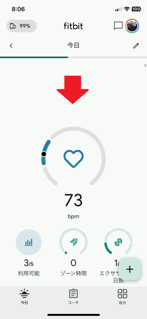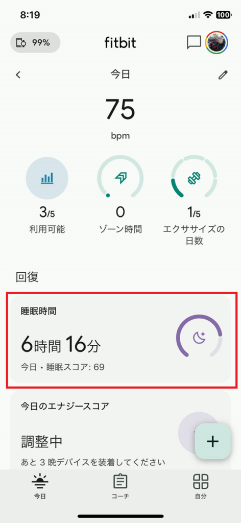 今日の睡眠スコアが表示されていれば同期に成功し、睡眠中のデータが取得できます。